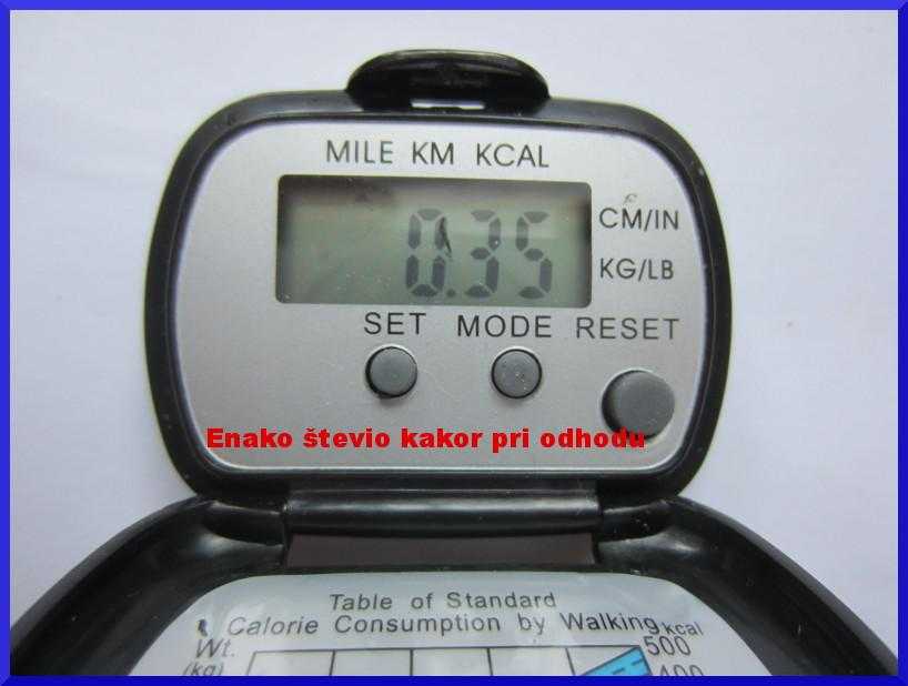 Števec korakov si želim samo zato, ker je bil v kompletu zraven pohodnih palic in ker ga že imam naj tudi deluje !!! Včeraj popoldne sem se vrnil nazaj domov zadovoljen, ker mi je zopet uspelo priti do rudniškega dimnika, in nezadovoljen, ker mi "pohodni števec" kljub zamenjavi baterije zopet ni odčital prehojenih kilometrov. Edino kar deluje na njem je ura, ki mi jo je včeraj dopoldne uspelo "sprogramirati".1 točka