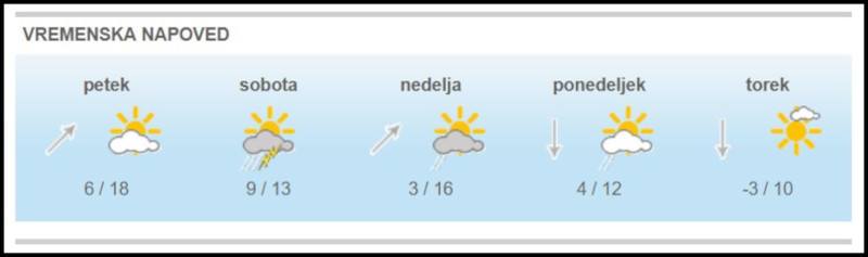 Danes so moja draga, najina hčerka, njen mož in njuna hčerka zaradi močnega prehlada ostali doma in niso šli v službo in vrtec. Edino jaz se še "nekaj posiljujem", vendar sumim, da se tudi meni, zaradi slabih občutkov v mojem grlu, nosu, glavi in kihanju, "nekaj kuha". Meteo.si Uradna vremenska napoved: Danes bo še dokaj sončno in toplo, pihal bo jugozahodnik. Jutri bo sprva deževalo, dan (čez dan ? ) pa bo dež ponehal.1 točka
