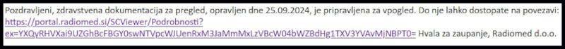 Patronažna sestra do sedaj še ni prišla,se pravi, da bo kmalu tu. Dokler kaj zase lahko storim sam, za pomoč ne prosim drugega. V torek imam pregled pri zdravniku in želel sem mu na USB ključ skopirati povezavo do mojega dobrega izvida MRI v Celju, vendar mi to ni uspelo, zato sem to povezavo "izrezal" iz maila, katerega sem najprej dobil kot SMS sporočilo na telefon in katerega mi je moj zet (?) "skopiral" v mail in mi ga potem poslal. Meni ta poslana povezava deluje, le pri prijavi v "ta portal" moram vnesti svojo številko zdravstvenega zaverovanja.1 točka